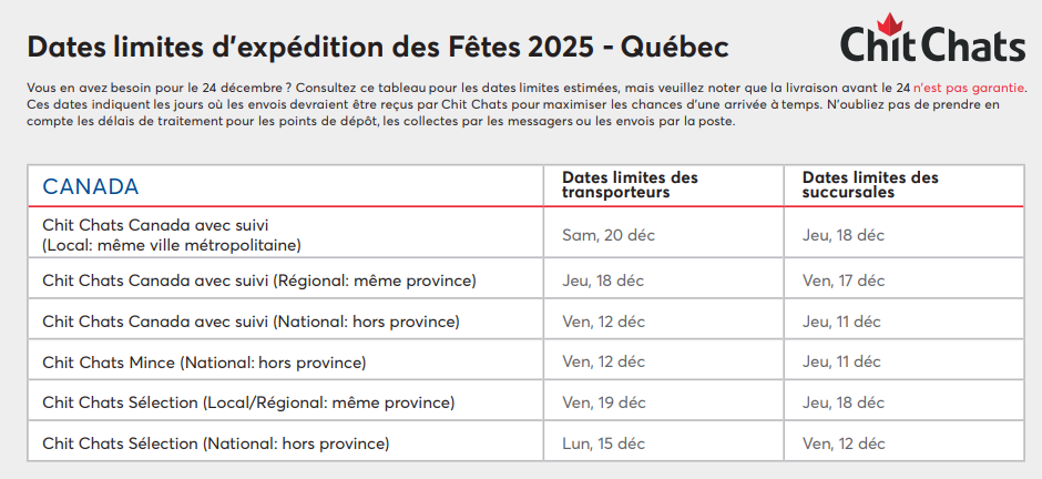 • N’oubliez pas que les colis doivent d’abord être reçus dans une succursale Chit Chats ! N’oubliez pas de tenir compte des délais de transit et de traitement pour les points de dépôt, les ramassages par courrier Canpar ou les envois postaux.