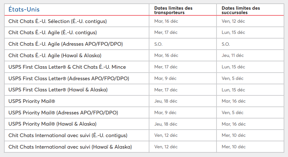Nous basons nos recommandations de dates limites sur les dates fixées par nos partenaires au début de la période des fêtes. Ces dates ne sont pas garanties. Bien que la période la plus chargée pour les envois commence généralement deux semaines avant Noël, nous vous encourageons vivement à envoyer vos envois encore plus tôt que les dates limites dans la mesure du possible.
