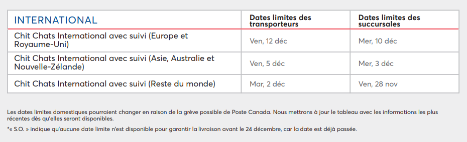 • Veuillez noter que les informations concernant les dates limites canadiennes peuvent changer a cause de la grève de Postes Canada.