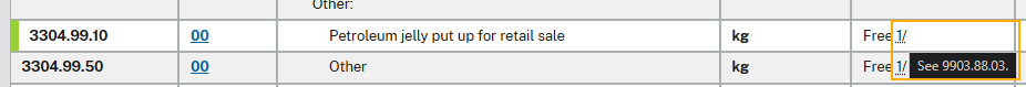 Depending on the product’s HTS code, an additional tariff for products from China may apply. These can be identified by hovering over the ‘1/’ in the HTS Schedule, and looking up the HTS Code provided in the tool tip, as pictured below: