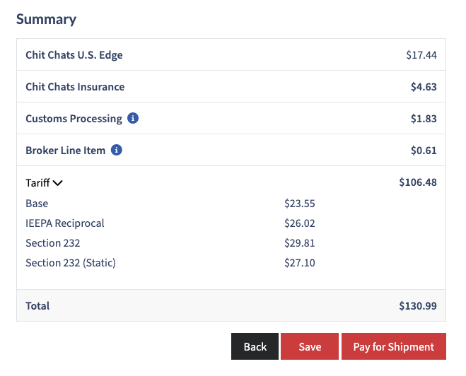 When purchasing a shipment, you can now view a detailed breakdown of your total tariff fees, showing exactly how each charge is calculated. This information is also accessible from the right-hand menu bar for easy reference.
