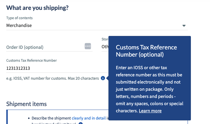 - We’ve clarified the Customs Reference Number section when creating shipments manually. The field now clearly indicates that this information must be entered on the platform (not written on the package) to ensure it’s properly transmitted to our partner carrier.