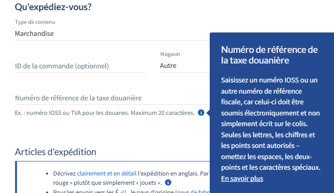 - Nous avons clarifié la section du numéro de référence douanière lors de la création manuelle des envois. Le champ indique maintenant clairement que cette infor0mation doit être entrée sur la plateforme (et non écrite sur le colis) afin d’être transmise correctement à notre transporteur partenaire.