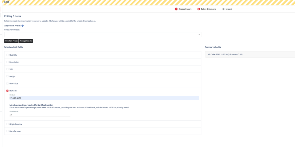 For those who import Store Integrations, we recommend creating shipment item presets to capture this information. You can edit the metal content of your items during import via the Edit Order Item tool, under the HS Code option:
